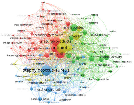The analysis of keyword co-occurrence revealed four main clusters that map the emerging subfields in research on Streptomyces against S. aureus. The first cluster, focused on biosynthesis and metabolic optimization, reflects the growing interest in the engineering of Streptomyces to increase antibiotic production or generate new derivatives. As reviewed by [47], strategies such as the activation of silent genes and regulatory manipulation have shown great potential to overcome production limitations in native strains.