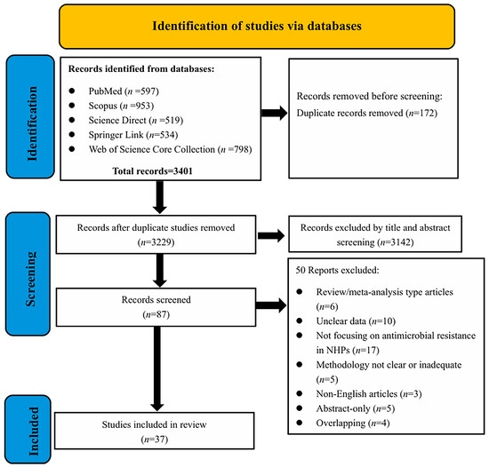 The PRISMA method identified a total of 3401 records from the following sources: PubMed (n = 597), Web of Science Core Collection (n = 798), Scopus (n = 953), Science Direct (n= 519), and Springer Link (n = 534). After excluding duplicate records (n = 172), the remaining records totaled 3229. By reviewing the titles and abstracts for relevance, we excluded irrelevant studies (n = 3142) because they did not cover the phenotypic and genotypic patterns of antimicrobial resistance in non-human primates (NHPs). The remaining 87 articles were assessed for eligibility based on the existing inclusion and exclusion criteria. Among these, 50 articles were excluded for the following reasons: review articles, conference abstracts, lack of NHP samples, and non-open access full texts. Ultimately, only 37 articles were included in this review (Figure 1).