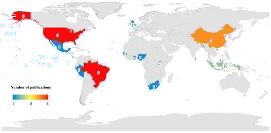 The 37 qualified and analysed journal articles included in the study were ranked in descending order as follows: Cercopithecidae 62.16% (n = 23), Callithrix 16.22% (n = 6), Cebidae 10.81% (n = 4), Hominidae 8.11% (n = 3), and Atelidae 2.7% (n = 1). The aforementioned journal articles encompassed antibiotic resistance data for NHPs from 20 countries across 6 continents, specifically, Brazil, the USA, China, Nepal, England, Indonesia, Senegal, Uganda, Costa Rica, Belgium, Peru, Brunei Darussalam, Sri Lanka, Bangladesh, South Africa, Nigeria, Saint Kitts and Nevis, Ghana, Gambia, and Mexico (Figure 2). Approximately 32.43% (n/N = 12/37) of the articles were conducted in Brazil and the USA, whereas 13.51% (n/N = 5/37) were conducted in China. All the journal articles included in this review provide crucial data on obtaining ARB and ARGs from NHPs (Table 1, Table 2, Table 3, Table 4 and Table 5).