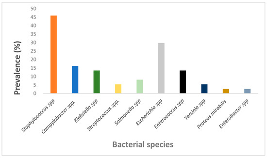 This systematic review primarily covers 10 bacterial genera (Staphylococcus spp., Campylobacter spp., Klebsiella spp., Streptococcus spp., Salmonella spp., Escherichia spp., Enterococcus spp., Yersinia spp., Proteus mirabilis and Enterobacter spp. Among them Staphylococcus spp., Escherichia spp., Campylobacter spp. and Enterococcus/Klebsiella spp. showed the most prevalence, at 45.95%, 29.73%, 16.22% and 13.51%, respectively (Figure 3). Staphylococcus spp. were prevalent among three out of the five NHP species, whereas Escherichia coli was identified in four out of the five NHP species, indicating their higher occurrence in NHPs.