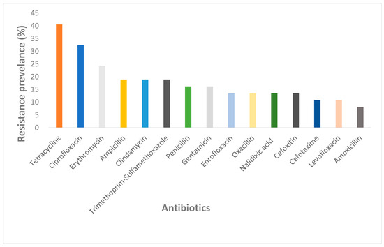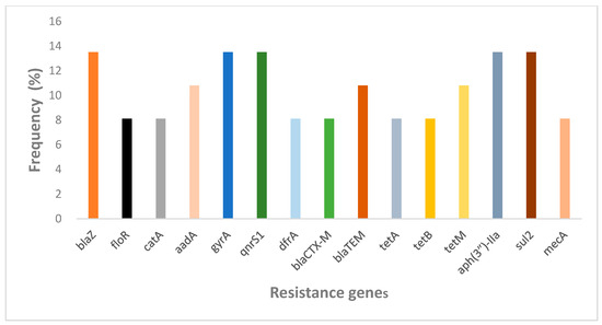 A total of 56.76% (n/N = 21/37) of the articles reported on resistance genes, primarily identified through PCR, WGS, and DNA microarray analysis. The presence of these genotypes was associated with antibiotic resistance in different categories of antibiotic phenotypes. However, due to the varying methods used to identify resistance genes, obtaining a combined prevalence rate for antibiotic resistance genes posed significant challenges. Therefore, the overall frequency of the top 15 resistance genes was summarised as a bar graph in Figure 5. This includes macrolides (ermC, mphC, msrA, msrC, and mreA), tetracyclines (tetA, tetB, tetM, tetO, tetL, tetS, tetK, and tet38), β-lactams (blaSHV, blaTEM, blaZ, blaEC, blaOXA, blaCTX-M, blaCTM-X, blaCMH-3, blaACT-6, and blaCMG1), methicillin (mecA), chloramphenicol (floR, catA, catB, and cmlA1), fluoroquinolones (qnrA, qnrB, oqxA, oqxB, qnrS1, qnrD, gyrA, and acrB), sulfonamides (sul1, sul2, sul3, dfrA, and dfrG), aminoglycosides (aacA-aphD, aac(3″)-IId, aadA, aph(3″)-IIa, and aph(6″)-Id), and fosfomycin (fosA). The results indicated that the resistant genes blaZ (β-lactams), qnrS1 and gyrA (fluoroquinolones), sul2 (sulfonamides), and aac(3″)-IId (aminoglycosides) were high and tet family genes (tetracyclines) were widely distributed, which confirms the antibiotic resistance phenotypic results. The sul2 antibiotic resistant gene was identified in four out of five NHP species, whereas qnrS1 and aac(3″)-IId genes were identified in two of out five NHP species.