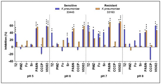 The MICs of tested compounds (TZ, PMZ, Fx, Sr, PAβN, CCCP, and ((2S)-2-amino-4-[bis[[2-[(3-methylphenyl)methoxy]phenyl]methyl]amino]butanoic acid (V9302)) were determined by the microdilution method in 96-well plates according to the Clinical and Laboratory Standards Institute (CLSI) guidelines [35] using Mueller-Hinton broth (MHB) at pH 5, 6, 7, and 8. The bacterial strains were cultured separately in media adjusted to pH 5–8 overnight at 37 °C, and the cultures grown at the corresponding pH were used in the assay.