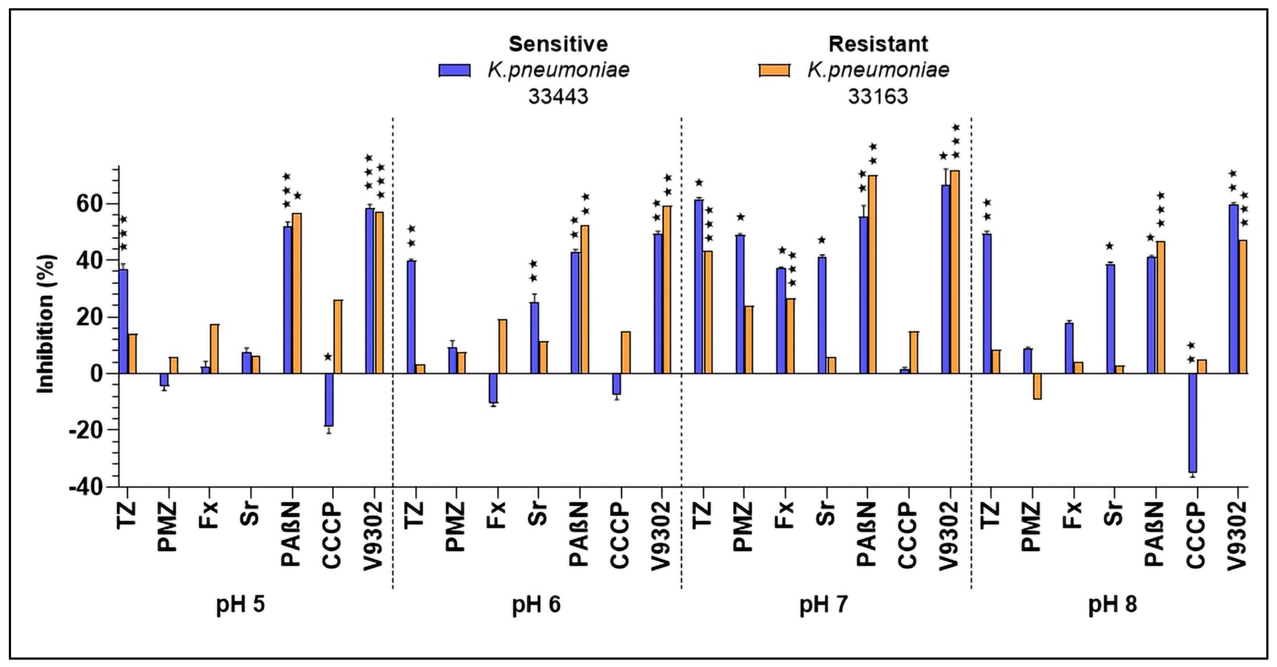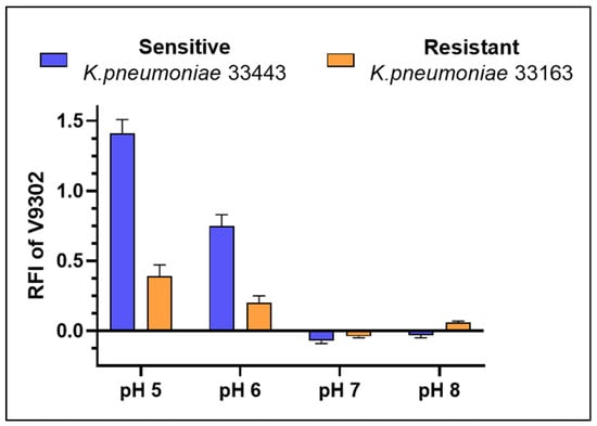 In addition, V9302 showed pH-dependent efflux pump inhibition. At 100 µM, it markedly increased EB accumulation in both K. pneumoniae strains at acidic pH, with the strongest effect at pH 5 (RFI 1.41 ± 0.10 in strain 33443; RFI 0.39 ± 0.08 in strain 33163). A moderate increase was also observed at pH 6, whereas no significant effect was detected at neutral or alkaline conditions (pH 7 and 8). Interestingly, while efflux inhibition was strongest at acidic pH, antibacterial activity peaked at neutral pH, indicating a divergent pH dependence of the two effects.