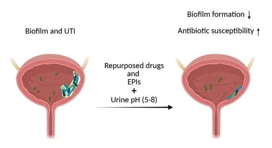 Drug repurposing has emerged as a promising strategy to combat urinary tract infections (UTIs) caused by pathogenic bacteria, particularly in the context of catheter-associated urinary tract infections (CAUTIs). The emergence of antibiotic resistance represents a major challenge in the treatment of UTIs, and efflux pump (EP) overexpression plays an important role in the development of multidrug resistance (MDR) in Gram-negative uropathogens. A key mechanism is the reduction in intracellular drug concentrations, either by limiting uptake or by actively pumping antibiotics out of the cell [1]. Fluoroquinolone resistance in Escherichia coli has been associated with the overexpression of EP-related genes, including structural components (acrA, mdfA, yhiU, and yhiV) and regulatory factors (such as marA) [2,3]. PCR revealed that tolC and ynfA EP genes were highly expressed in 75–80% of multidrug-resistant E. coli isolates from UTI patients, highlighting their major role in resistance [4]. In E. coli and Klebsiella pneumoniae, RND efflux systems such as AcrAB-TolC, AcrAD-TolC, and AcrFE-TolC are common, and Al-Dahmoshi et al. found that over 90% of isolates were MDR, especially against β-lactams and cephalosporins [5]. Fluoroquinolone resistance in K. pneumoniae is mainly explained by mutations in DNA gyrase and topoisomerase IV, but reduced susceptibility is further supported by plasmid-mediated quinolone resistance determinants, including QepA, and OqxAB EPs. Importantly, the OqxAB system has been shown to help K. pneumoniae tolerate increasing concentrations of ciprofloxacin [6]. Taken together, these findings emphasize the clinical importance of EPs in UTI pathogens and highlight their potential as targets for adjuvant strategies.