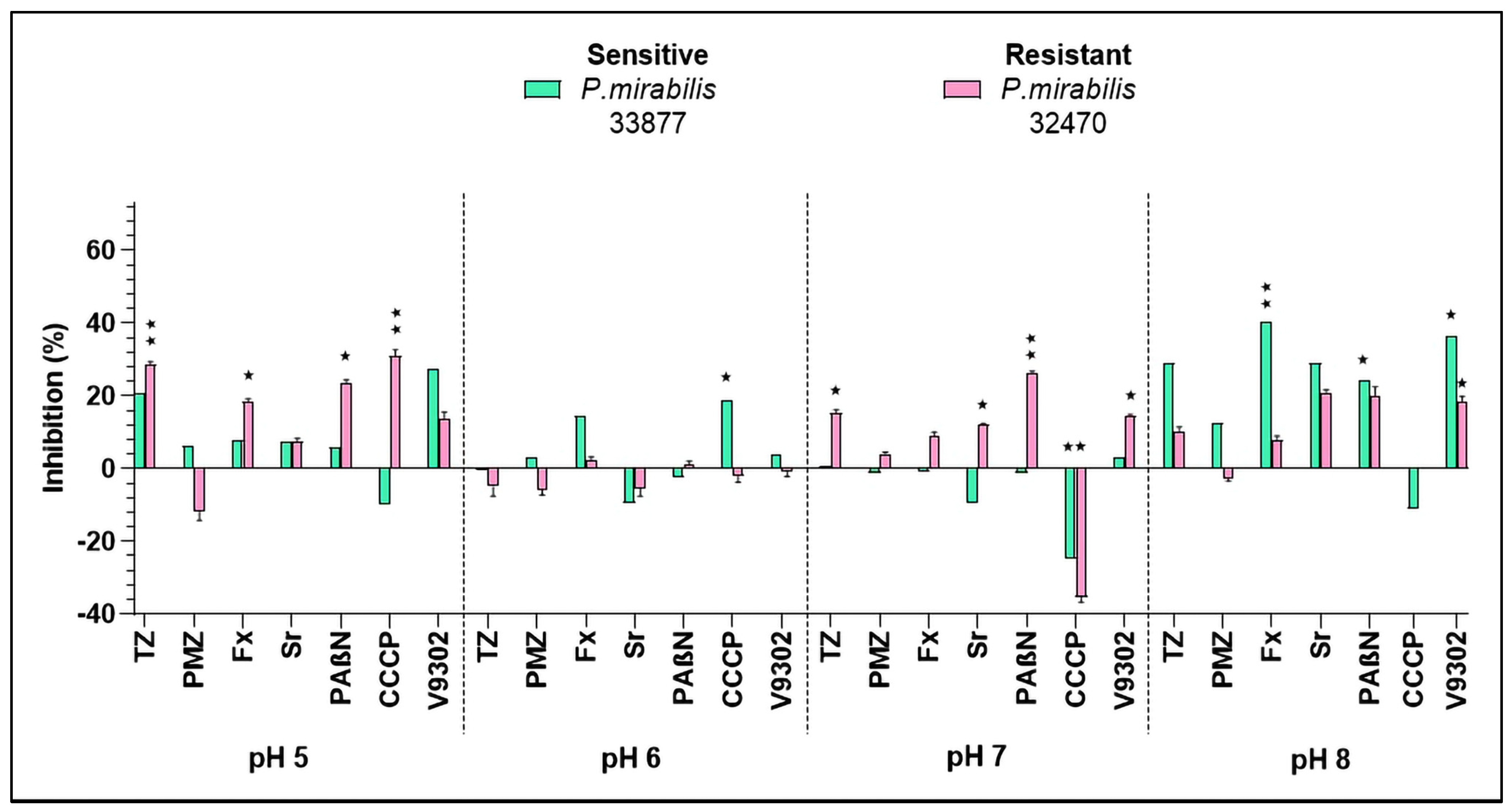 The isolates of P. mirabilis were less sensitive towards the tested anti-biofilm drugs. TZ was active at pH 5 and pH 8, showing less activity at the acidic pH (inhibition of 20.92%) compared to the alkaline pH (inhibition of 28.95%) on the sensitive P. mirabilis 33877 strain. Fx and Sr exerted anti-biofilm activity at pH 8 (40.37% and 29.08%, respectively); furthermore, the EPI compound PAβN could also interfere with biofilm formation (24.48% of inhibition) on the sensitive P. mirabilis 33877 strain. Out of the tested resistance modifiers, only PAβN showed efficacy at three pHs (pH 5, 7, and 8) on the resistant P. mirabilis 32470 strain, but the activity was around 20% at all pHs. CCCP and TZ were active at pH 5 (inhibition of 30.98% and 28.63%, respectively) on the resistant P. mirabilis (Figure 2). At pH 8, CCCP promoted biofilm formation in the resistant P. mirabilis isolate, with a change of −103.59% (± 1.07) compared to the untreated control.