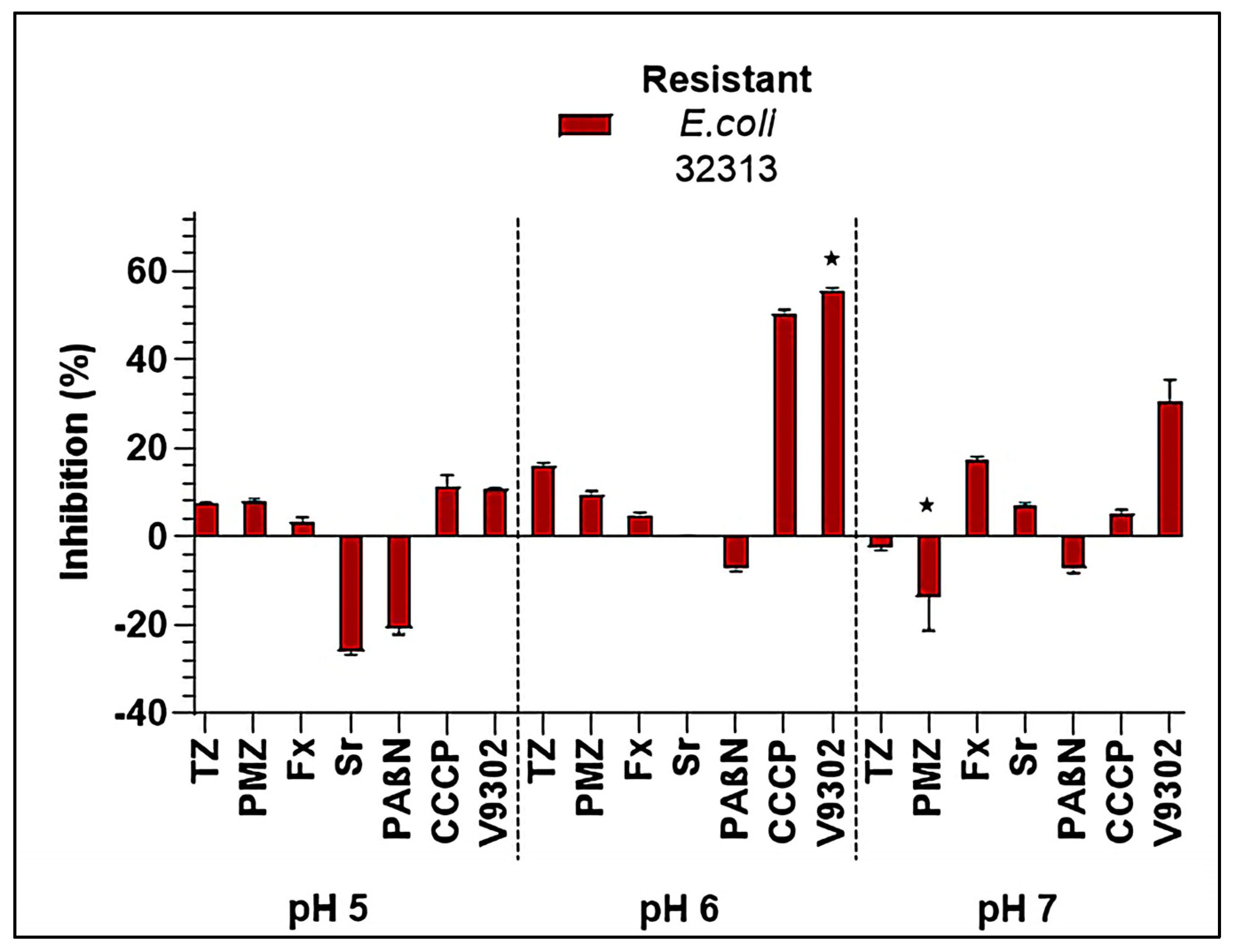 The sensitive E. coli 33504 strain did not produce biofilms. The resistant 32313 strain produced biofilm at pH 5, 6, and 7. Biofilm formation was inhibited by CCCP (50.21%) and V9302 (55.61%) at pH 6. At pH 7, V9302 had less activity on this strain (30.36%) and Fx exerted a slight anti-biofilm effect (17.53%; Figure 3).