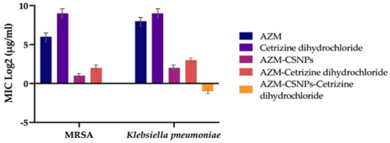 Figure 2 indicates that the MIC of azithromycin 64 µg/mL, cetirizine dihydrochloride 512 µg/mL, azithromycin-loaded chitosan nanoparticle 2 µg/mL, azithromycin + cetirizine dihydrochloride 4 µg/mL, and azithromycin-loaded CSNPs in combination with cetirizine dihydrochloride was 1 µg/mL, representing a reduction in MIC against MRSA. Similarly, the MIC of azithromycin 256 µg/mL, cetirizine dihydrochloride 512 µg/mL, azithromycin-loaded chitosan nanoparticle 4 µg/mL, azithromycin + cetirizine dihydrochloride 8 µg/mL, and azithromycin-loaded CSNPs 0.5 µg/mL against K. pneumoniae revealed good results with the nanoparticle combination. Reduction in MIC value in combination and nanoparticle form explained the effectiveness of the drug combination as compared to the pure drug alone. The lower the value of MIC, the higher the efficacy.