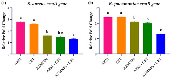 Responses of target genes, normalized using 16sRNA as a reference housekeeping gene through the Relative Expression (fold change) = 2−ΔΔCt method, considering (p < 0.05). Note: Figure 3 explains the comparison of the relative fold expression of the ermA gene in S. aureus (a) and the ermB gene in K. pneumoniae (b). Data are expressed as mean ± SEM (n = 3). Bars annotated with different superscript letters (a, b, c) indicate statistically significant differences between groups based on multiple comparison tests (p < 0.05); bars sharing the same letter are not significantly different.