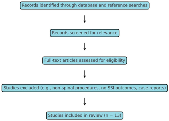 This narrative review aimed to assess the comparative effectiveness and safety of vancomycin compared to cefazolin in the context of surgical antibiotic prophylaxis for spinal procedures. A thorough examination of the literature was conducted through keyword-driven searches in PubMed and Scopus, complemented by manual reference screening. Combinations of terms such as “spine surgery”, “surgical site infection”, “prophylaxis”, “vancomycin”, “cefazolin”, “MRSA”, “VRE”, and “resistance” were included. The investigation encompassed the timeframe from January 2008 to August 2025, with the final search conducted on 3 August 2025, and was enhanced by a thorough manual review of reference lists. Studies that met the criteria were clinical investigations, including randomized controlled trials, cohort studies, or case–control designs, which assessed surgical antibiotic prophylaxis in spinal surgery. These studies specifically involved cefazolin and/or vancomycin, either individually or in combination, and reported outcomes related to surgical site infection (SSI) rates or microbiological findings. The criteria for exclusion included non-spinal procedures, case reports, conference abstracts, editorials, and studies that did not provide data on SSI outcomes. A total of 13 studies fulfilled these criteria and were incorporated for synthesis (Figure 1). The lack of a formal risk of bias or study quality assessment is due to the diverse designs, outcome definitions, and reporting methods present in the studies. This gap is a significant limitation and is clearly stated in the Section 3.8.
