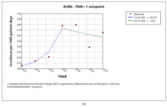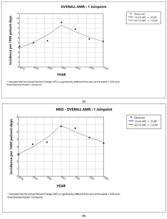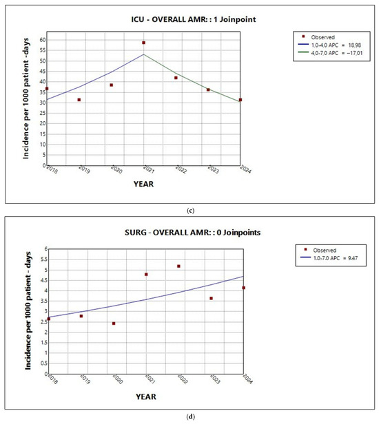 Results: Overall AMR exhibited a transient peak around 2021 across the hospital, except in the surgical sector. A significant rise in average annual percentage change (AAPC) occurred only in the medical sector (