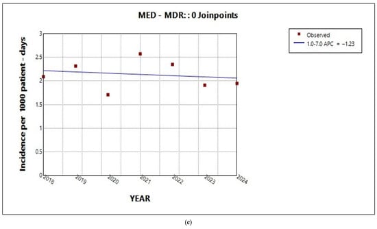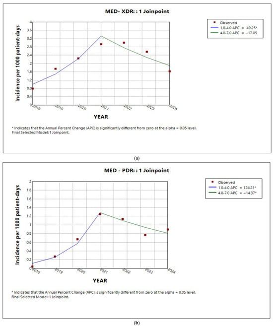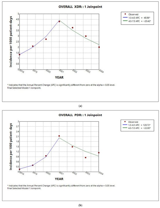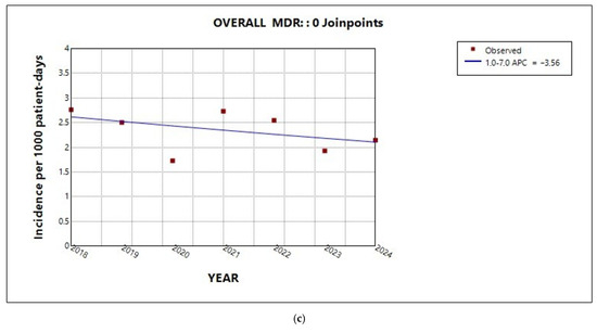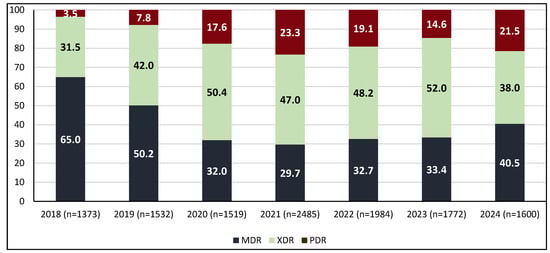 Methods: Multiresistant bacteria isolated from all biological specimens of hospitalized patients between January 2018 and December 2024 were recorded and classified as multidrug- (MDR), extensively drug- (XDR), or pandrug-resistant (PDR). Overall AMR was defined as the sum of these categories. Annual incidences of overall AMR, its categories, and predominant Gram-negative (