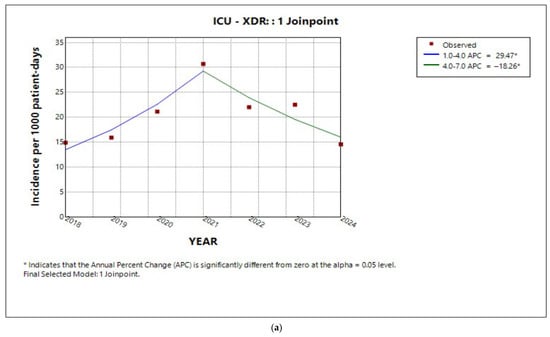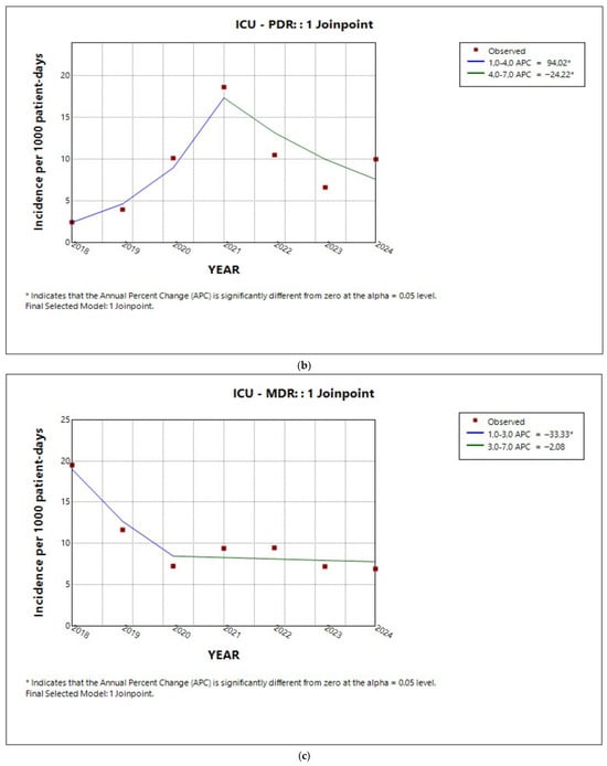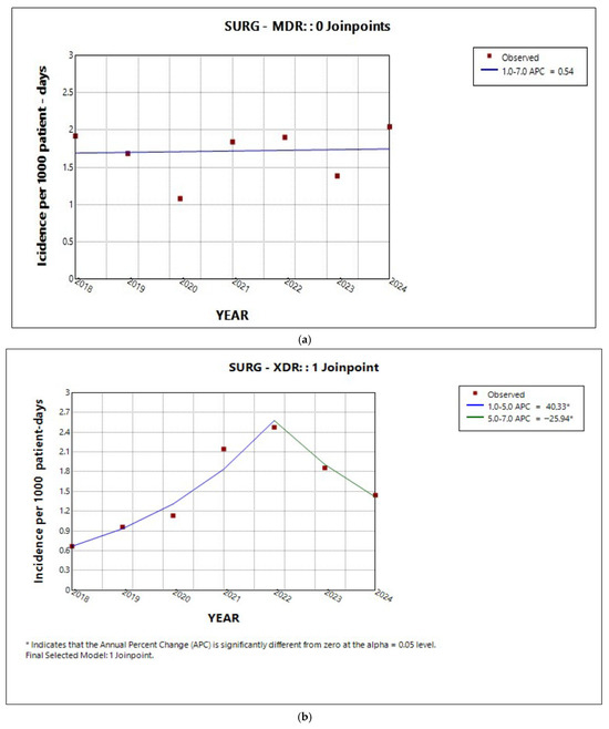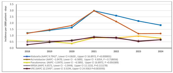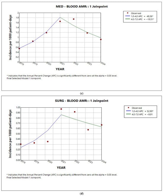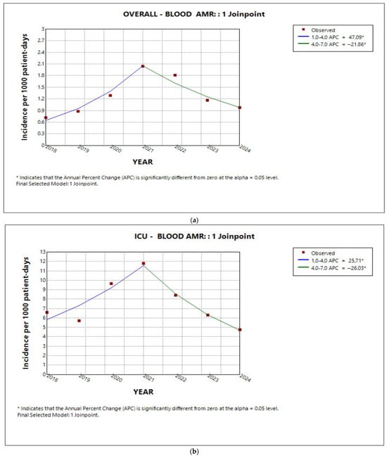 Enterococcus (VRE)] pathogens were analyzed for the entire hospital and by sector (medical, intensive care unit [ICU], surgical). Bloodstream infection (BSI) AMR was also evaluated. Trend analysis was performed using Joinpoint regression.