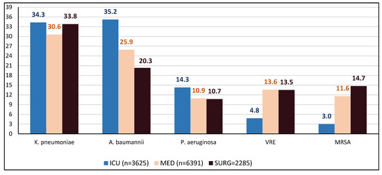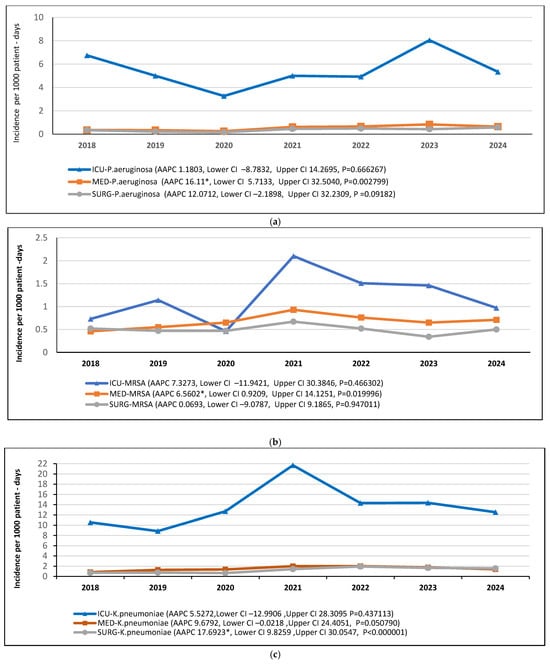 P. aeruginosa, MRSA, and VRE rose significantly in the medical sector, whereas ICU incidences remained largely stable despite the 2021 peak.