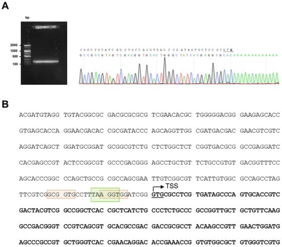Identification of nucS TSS. (A) Results of 5′-RACE experiment. A gel image showing the band obtained after performing the 5′-RACE technique, which was sequenced to identify the TSS of nucS in M. smegmatis. The TSS of nucS is highlighted in bold, corresponding to the complementary base to the first nucleotide following the poly-A tail. The TSS coincides with the translation start of nucS (the first G of the start codon GTG, which is underlined). (B) Upstream sequence of nucS in M. smegmatis. The start of the coding sequence of the nucS gene is shown in bold, with the GTG start codon underlined. The identified transcription start site (TSS), determined by 5′-RACE, is indicated with an arrow. The colored boxes represent potential −10 regions for binding of sigma factors in M. smegmatis: green for σA (TANNNT) [22] and orange for σB (NNGNNG) [23].