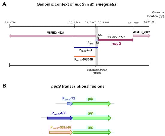 Genomic context of nucS in M. smegmatis and schematic of nucS transcriptional fusions. (A) Genomic context of the nucS gene in M. smegmatis mc2 155. The position of nucS in the genome of M. smegmatis mc2 155 (NC_008596) is shown, along with the upstream regions of the gene (PnucS-73, PnucS-408 and PnucS-408∆46) that were included in the transcriptional fusions with gfp. The position of the nucS TSS is also indicated. (B) Schematic representation of the nucS::gfp transcriptional fusions. The three nucS upstream regions of different lengths cloned into the reporter vectors are shown, each followed by the gfp gene.