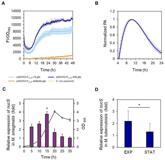 Study of nucS expression during growth. (A) Spectrofluorometric analysis of reporter strains during growth. Normalized fluorescence (FI/OD595, arbitrary units) of M. smegmatis strains carrying different nucS::gfp transcriptional fusions: pSGV53-PnucS-73-gfp (light blue), pSGV53-PnucS-408-gfp (dark blue) and pSGV53-PnucS-408∆46-gfp (orange). Autofluorescence of non-transformed cells (no plasmid) is shown in yellow (C-, negative control). Data represent the mean ± standard error (SE) of eight biological replicates (n = 8). (B) Promoter activity of M. smegmatis nucS. The promoter activity (PA) values of the M. smegmatis reporter strain harboring the plasmid pSGV53-PnucS-408-gfp normalized to their respective maximum are shown (see Materials and Methods). Error bars: SE (n = 8). (C) Measurement of nucS expression in M. smegmatis during growth by RT-qPCR. Bars show the relative expression levels of nucS normalized to the endogenous control sigA at different growth times. Relative expression was calculated using the 2−ΔΔCt method, with the latest time point (35 h) serving as the control with baseline levels, assigned a value of 1. The growth curve showing OD600 values at the different time points when samples were collected is represented in gray. Error bars: SE (n = 3). *: p < 0.05 (15 h vs. 35 h), Student’s t-test for paired samples. (D) Measurement of nucS expression in M. tuberculosis H37Rv at different growth phases by RT-qPCR. Bars show the expression levels (2−ΔΔCt method) of nucS normalized to the endogenous control lpqM at late exponential phase (EXP) (OD600 = 1) relative to the value at stationary phase (STAT) (OD600 = 5). Error bars: SE (n = 3). *: p < 0.05, Student’s t-test for paired samples. A growth curve of M. tuberculosis H37Rv is shown in Figure S2.