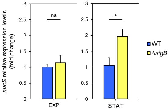 Given our hypothesis that sigB negatively regulates nucS expression during the stationary phase, we anticipated higher nucS expression in the ΔsigB mutant compared to the wild-type strain during this phase. RT-qPCR analysis revealed no differences in nucS expression between the two strains during the exponential phase. However, during the stationary phase, nucS expression in the ΔsigB strain was approximately twofold higher than in the wild-type strain (p = 0.0259), suggesting negative regulation of nucS by sigB in the stationary phase (Figure 5).