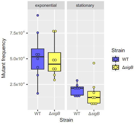 Comparison of mutant frequency between WT and ΔsigB strains during exponential and stationary phases. Box plots comparing mutant frequencies between the WT (blue) and ΔsigB (yellow) strains during the exponential and stationary phases. The thick black line inside each box represents the median, and the dots show mutant frequency values for each replicate (n = 8). No significant differences in mutant frequencies were observed between the two strains in either the exponential or stationary phase (p > 0.05; Mann–Whitney U test). The plots were generated using the ggplot2 package (v3.3.3) in R (v4.0.5).