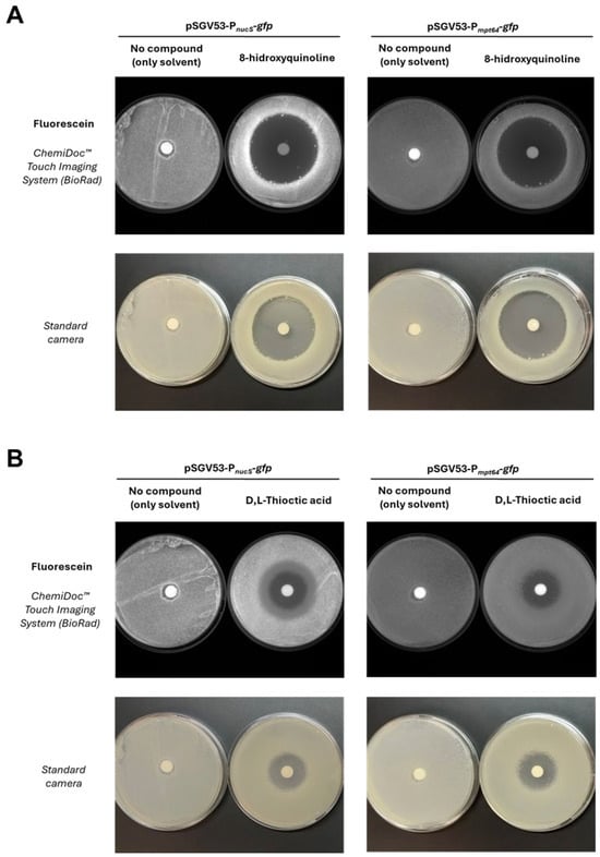 Through this assay, only two compounds showed a specific effect on nucS expression, producing an increase or decrease in fluorescence relative to the negative control (disk with solvent only) that is not observed in the constitutive expression control (carrying the pSGV53 vector). Specifically, 8-hydroxyquinoline was identified as a potential inducer (Figure 7A), and D,L-thioctic acid as a potential repressor (Figure 7B). 8-hydroxyquinoline is a quinoline-family antibiotic with metal-chelating properties [31] and has been reported to exhibit potential mutagenic effects [32]. D,L-thioctic acid, also known as α-lipoic acid, also exerts metal-chelating capacity and is primarily recognized for its antioxidant properties, acting as a free radical scavenger and contributing to the repair of oxidative damage [33,34].
