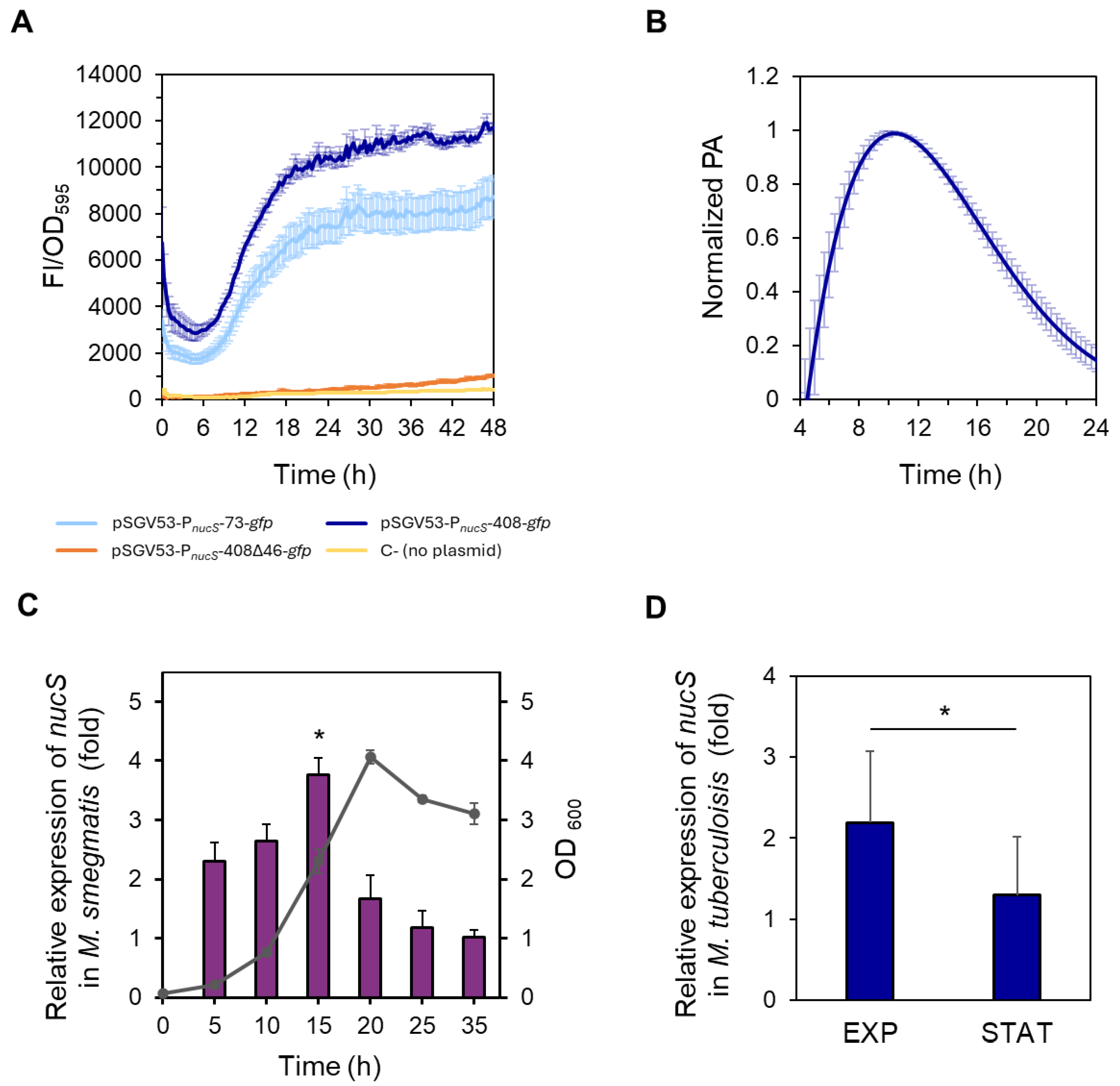 M. smegmatis is strongly dependent on the growth phase. We observed the highest promoter activity during exponential growth, with a marked reduction in the stationary phase. This finding was corroborated by RT-qPCR and Western blot analyses, all of which suggested that