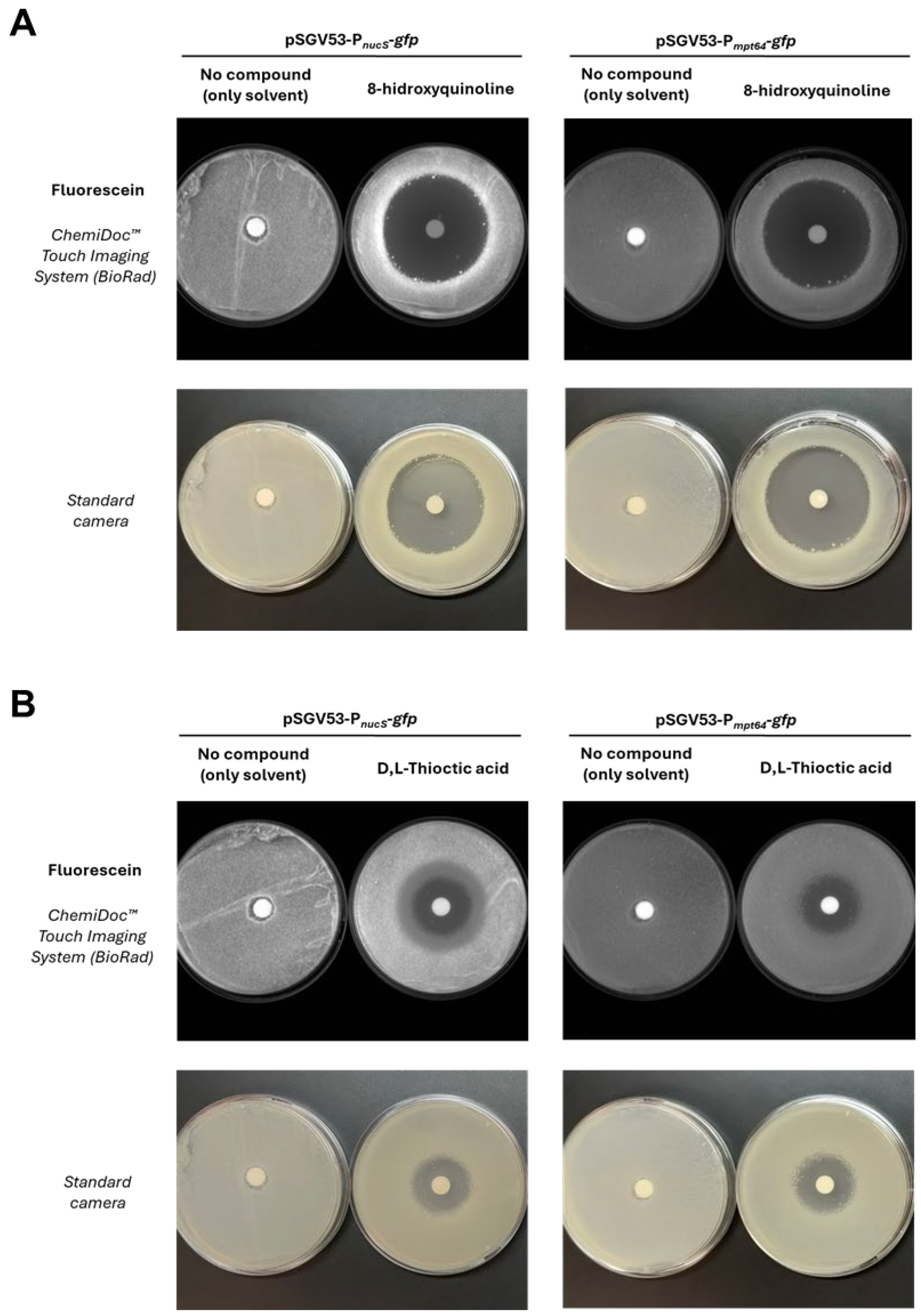 Table S3). Disks containing only the corresponding solvent were used as negative controls. After incubation at 37 °C for 72 h, fluorescence was visualized using a ChemiDoc™ Touch Imaging System (BioRad) under fluorescein settings (Blot > Fluorescein). Photographs of the plates were also taken to provide a visual reference for cell mass distribution. For compounds showing a specific effect on
