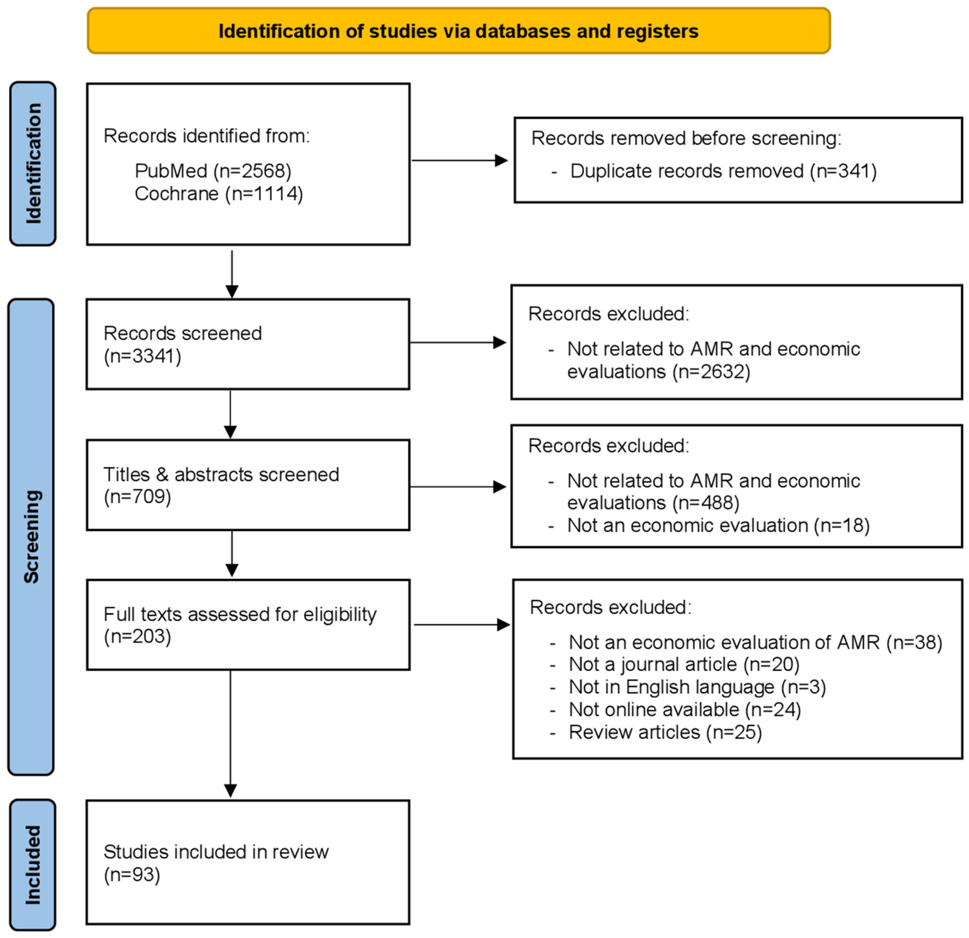 | PubMed | (“antimicrobial*”[Title/Abstract] OR “antibiotic*”[Title/Abstract] OR “antibacterial*”[Title/Abstract] OR “antiviral*”[Title/Abstract] OR “antifungal*”[Title/Abstract] OR “antiparasitic*”[Title/Abstract]) AND (“resistan*”[Title/Abstract] OR “overus*”[Title/Abstract] OR “misus*”[Title/Abstract]) AND (“economic evaluation”[Title/Abstract] OR “economic burden”[Title/Abstract] OR “cost effective*”[Title/Abstract] OR “cost utility”[Title/Abstract] OR “cost benefit”[Title/Abstract] OR “cost of illness”[Title/Abstract] OR “cost minimization”[Title/Abstract] OR “incremental cost-effectiveness ratio”[Title/Abstract] OR “qaly*”[Title/Abstract] OR “quality adjusted life year*”[Title/Abstract] OR “daly*”[Title/Abstract] OR “disability adjusted life year*”[Title/Abstract]) | 2568 |