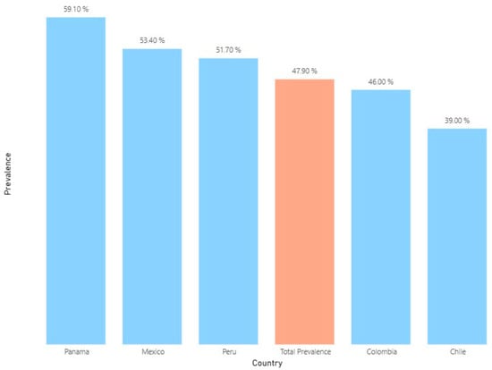 When comparing our findings to pre-COVID-19 data by country, we observed varying trends. While Mexico and Colombia showed a slight decrease in AB use (prevalence of 60% pre-COVID-19 to 53% in this study vs. prevalence of 52.8% pre-COVID-19 to 46%, respectively), prevalence in Peru remained stable (51% in 2019 to 48%), and Chile reported a modest increase despite maintaining the lowest prevalence in the cohort (prevalence of 35.9% in 2016 to 39% in this study) [,,,,].