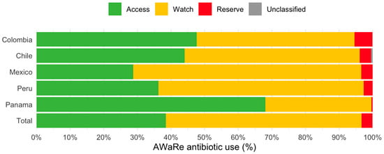Figure 2 shows AB use according to WHO’s Access, Watch, and Reserve (AWaRe) classification []. The largest proportion corresponded to the Watch group (58.2%; n = 4500), followed by the Access (38.5%; n = 2978), Reserve (3.2%; n = 246), and Unclassified (0.1%; n = 11) groups. While Colombia, Chile, Mexico, and Peru exhibited the greatest proportion of ABs in the Watch group, the Panamanian hospital showed the largest proportions corresponding to the Access group (68.1%) and was the only one compliant with the WHO’s recommendations.