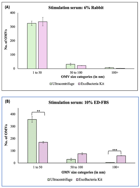 Size distribution of Bb-OMVs purified using different isolation methods and serum conditions. (A) Bb-OMVs isolated by ultracentrifugation or ExoBacteria™ kit following stimulation with 6% rabbit serum. (B) Bb-OMVs isolated by the same isolation methods with 10% ED-FBS stimulation. Diameters of 300 Bb-OMV vesicles of each experimental condition were measured using the TEM micrographs and grouped into 0–50 nm, 50–100 nm, and >100 nm. Statistical analysis was performed using Student’s t-test for paired samples (Microsoft Excel, Redmond, WA, USA). Statistical significance is indicated as ** p < 0.01, and *** p < 0.001.