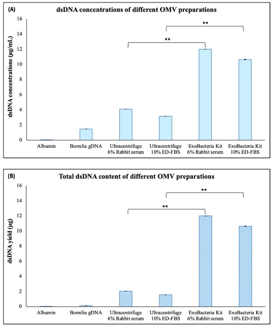 Quantification of dsDNA in different Bb-OMV samples isolated by ultracentrifugation and the ExoBacteria™ kit with different stimulation sera, using a Qubit 2.0 fluorometer with broad-range assay. B. burgdorferi B31 strain gDNA was used as a positive control and 1 mg/mL albumin was used as a negative control. (A) dsDNA concentrations (µg/mL) of different preparations of purified Bb-OMVs; (B) Total dsDNA content (µg) in different preparations of purified Bb-OMVs. The error bars indicate ± standard error of the mean (SEM) for each data point. The dsDNA content of Bb-OMVs of different isolation methods were compared. Statistical analysis was performed using Student’s t-test for paired samples (Microsoft Excel, Redmond, WA, USA). Statistical significance is indicated as ** p < 0.01.