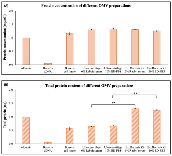 Quantification of protein in different Bb-OMV samples isolated by ultracentrifugation and the ExoBacteria™ kit with different stimulation sera, using Bradford’s assay. 1 mg/mL albumin was used as a positive control and B. burgdorferi B31 strain gDNA was used as a negative control. (A) protein concentrations (mg/mL) of different preparations of purified Bb-OMVs; (B) Total protein content (mg) in different preparations of purified Bb-OMVs. The error bars indicate ± standard error of the mean (SEM) for each data point. The protein content of Bb-OMVs of different isolation methods were compared. Statistical analysis was performed using Student’s t-test for paired samples (Microsoft Excel, Redmond, WA, USA). Statistical significance is indicated as ** p < 0.01.