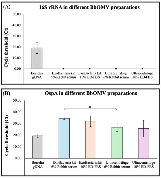 Gene expression profiles of OMVs isolated from B. burgdorferi using RT-PCR. Expression levels of (A) 16S rRNA bacterial signature and (B) OspA, outer surface protein in different Bb-OMV preparations. B. burgdorferi genomic DNA was used as a positive control. The results were compared between the OMV isolation methods using the same stimulation serum. The error bars indicate ± standard error of the mean (SEM) for each data point. Statistical analyses were performed using Student’s t-test for paired samples (Microsoft Excel, Redmond, WA, USA), on three independent RT-PCR experiments. Statistical significance is indicated as * p < 0.05.