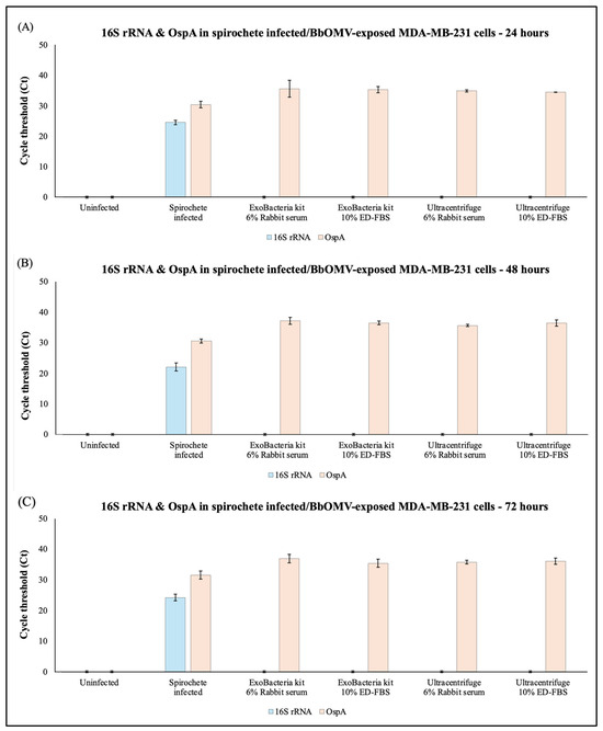 Evidence of spirochete and Bb-OMV uptake in MDA-MB-231 cells following infection with B. burgdorferi spirochetes or exposure to B. burgdorferi OMV samples for 24 h (Panel (A)), 48 h (Panel (B)) and 72 h (Panel (C)) using RT-qPCR method as described below. 16S rRNA was used as a marker for bacterial signature in infected or OMV-exposed MDA-MB-231 cells, while OspA indicates the presence of B. burgdorferi-specific outer surface membrane protein in infected or exposed MDA-MB-231 cells. The results were compared between the OMV isolation methods using the same stimulation serum. The error bars indicate ± standard error of the mean (SEM) for each data point. Statistical analyses were performed using Student’s t-test for paired samples (Microsoft Excel, Redmond, WA, USA), on three independent RT-qPCR experiments.