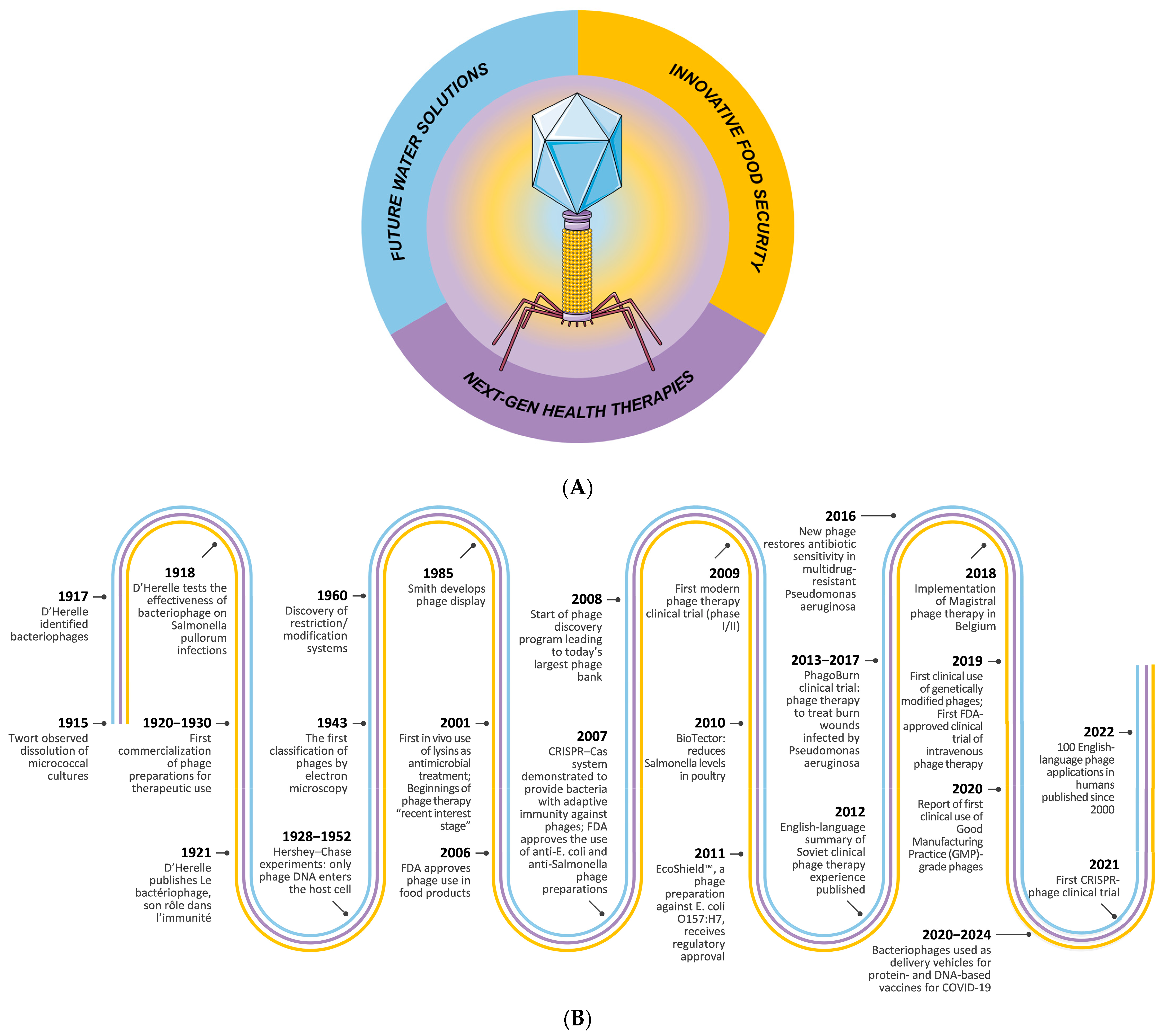 Bacteriophages or phages are viruses that infect only bacteria. They are obligate intracellular parasites []. They are the most abundant biological entities on the planet, with an estimated total population of over 1031 phages [], being present in oceans, lakes, sewage, drinking water, soil and food []. They were co-discovered independently by Frederick William Twort and Félix Hubert d’Hérelle [] (Figure 1B). In 1915, Twort noticed that there was a filterable, transparent, and infectious agent that induces the dissolution of cultures of micrococci, without defining its nature.