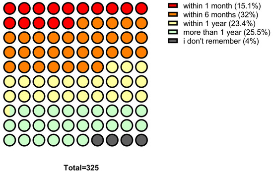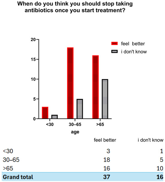 Regarding antibiotic use, 15.1% (n = 49) of participants reported taking antibiotics in the last month, 32.0% (n = 104) in the last six months, 23.4% (n = 76) in the last year and 25.5% (n = 83) more than a year ago, 4.0% (n = 13) could not recall. Overall, 70.5% (n = 229) reported at least one antibiotic course in the last year (Figure 2). Concerning prescriptions, 90.2% (n = 293) reported taking antibiotics on medical advice, 3.4% (n = 11) without a prescription, and 6.2% (n = 20) could not recall. In addition, 82.5% (n = 268) received instructions from a healthcare professional, while 4.3% (n = 14) did not receive instructions and 13.2% (n = 43) could not remember. (Figure 3) Regarding treatment duration, 83.7% (n = 272) answered correctly (completion of prescribed doses), 11.4% (n = 37) reported stopping when symptoms improved, and 4.9% (n = 16) did not know. The response “when I feel better” was more frequent among those >65 years 4.9% (n = 16), followed by those aged 30–65 years 5.5% (n = 18) and <30 years 3.1% (n = 3). Uncertainty was also higher among those >65 years (n = 10) (Figure 4).