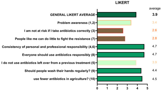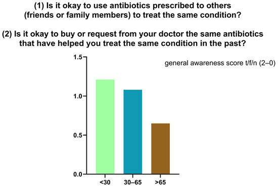 Responses to the ten Likert-scale items (1 = strongly disagree; 5 = strongly agree) provided insight into awareness, perceived risk, responsibility, and preventive behaviors (Figure 9). Awareness of the seriousness of AMR averaged 3.4/5, decreasing with age. The statement “I am not at risk if I take antibiotics correctly” scored 2.6, also decreasing with age. Personal responsibility scored low (2.8), while collective responsibility was widely acknowledged (4.7). Statements on prescriptions scored highly (4.7), as did those on advanced antibiotics (3.9). Preventive behaviors such as hand washing (4.4) and reduced antibiotic use in livestock (4.5) were also well recognized. Combined analysis of Likert and true/false results showed an inverse correlation with age: <30 years (Likert 4.04; true/false 6.21), 30–65 years (3.92; 5.89), >65 years (3.78; 4.68).