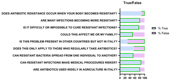Representation of responses relating to knowledge about antibiotic resistance. Green borders indicate the correct answer (“True” or “False”) for each question.