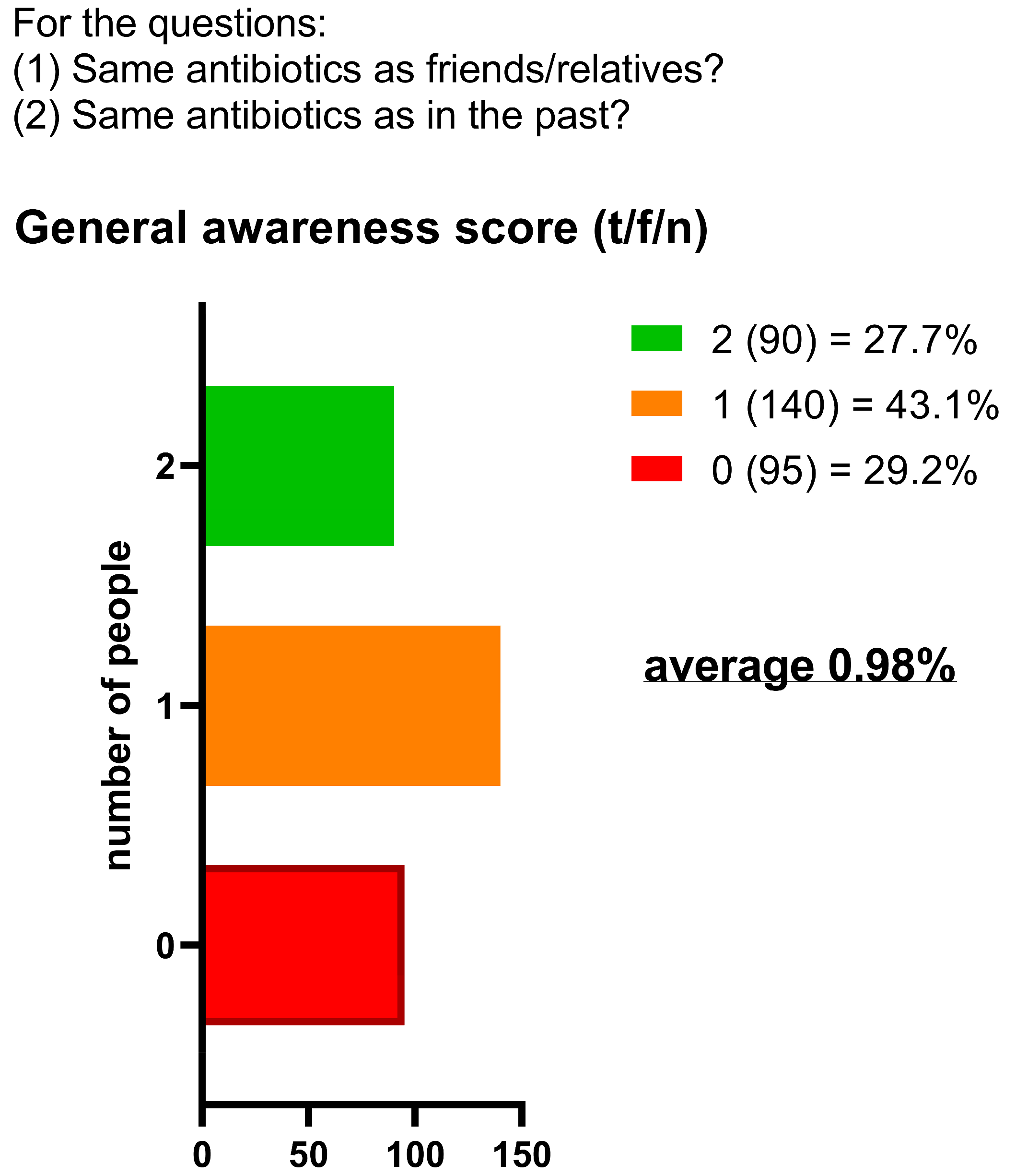 - Knowledge section: assessment of basic knowledge on the appropriate use of antibiotics, the distinction between bacterial and viral infections, and the mechanisms of antibiotic resistance, using multiple-choice questions and “True/False” questions;
