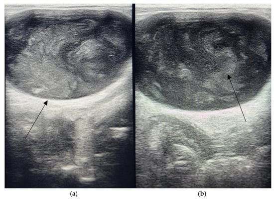 The ultrasonographic appearance of the urinary bladder in a rabbit naturally infected with Staphylococcus sciuri. The bladder wall exhibits increased echogenicity, indicative of chronic inflammatory infiltration and mucosal edema. (a) The intraluminal content is heterogeneously hyperechoic, containing suspended particulate material and flocculent debris consistent with inflammatory exudate, epithelial desquamation, and bacterial aggregates. (b) These sonographic features are characteristic of bacterial cystitis with advanced inflammatory remodeling of the bladder wall and accumulation of dense sediment within the lumen.