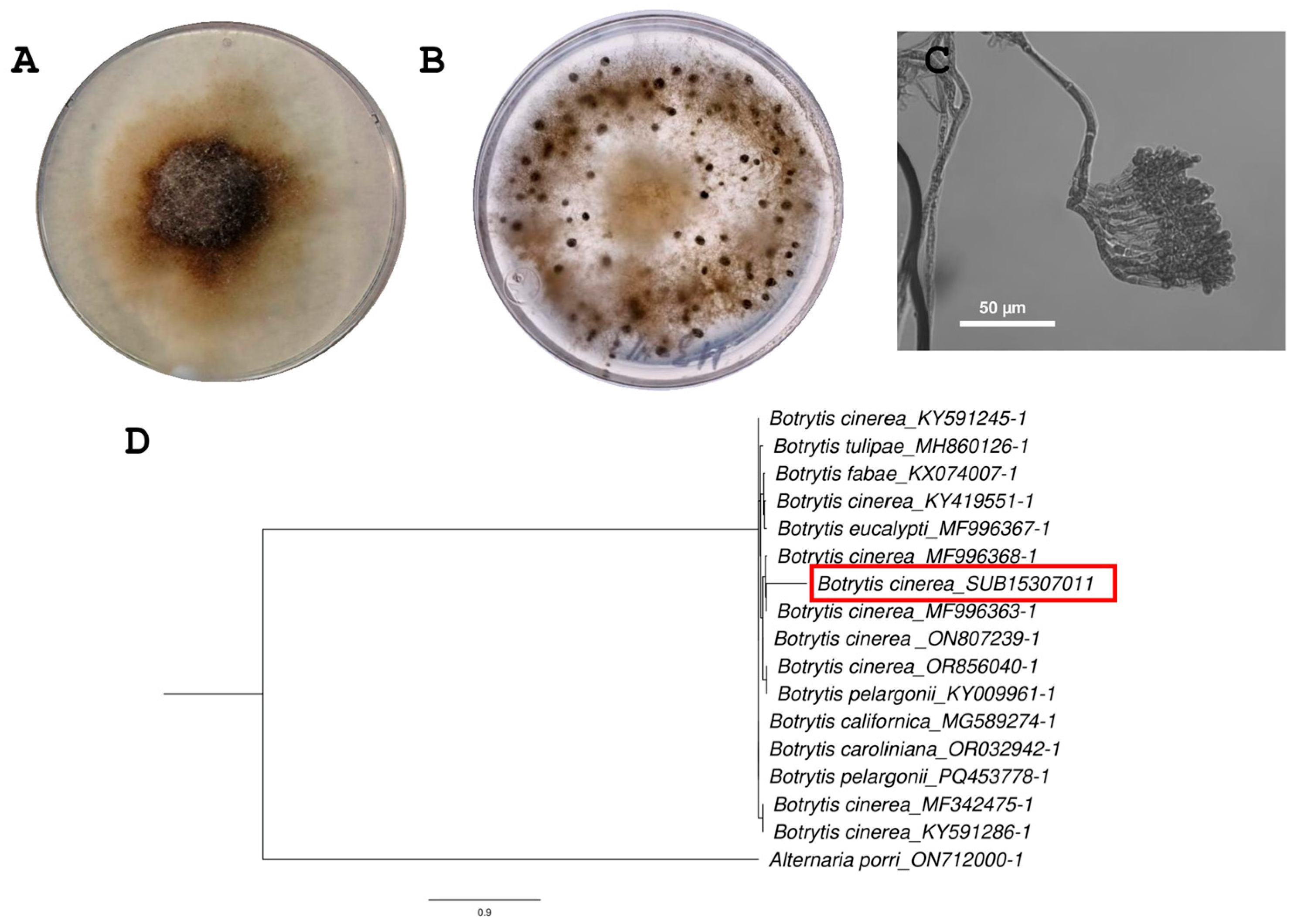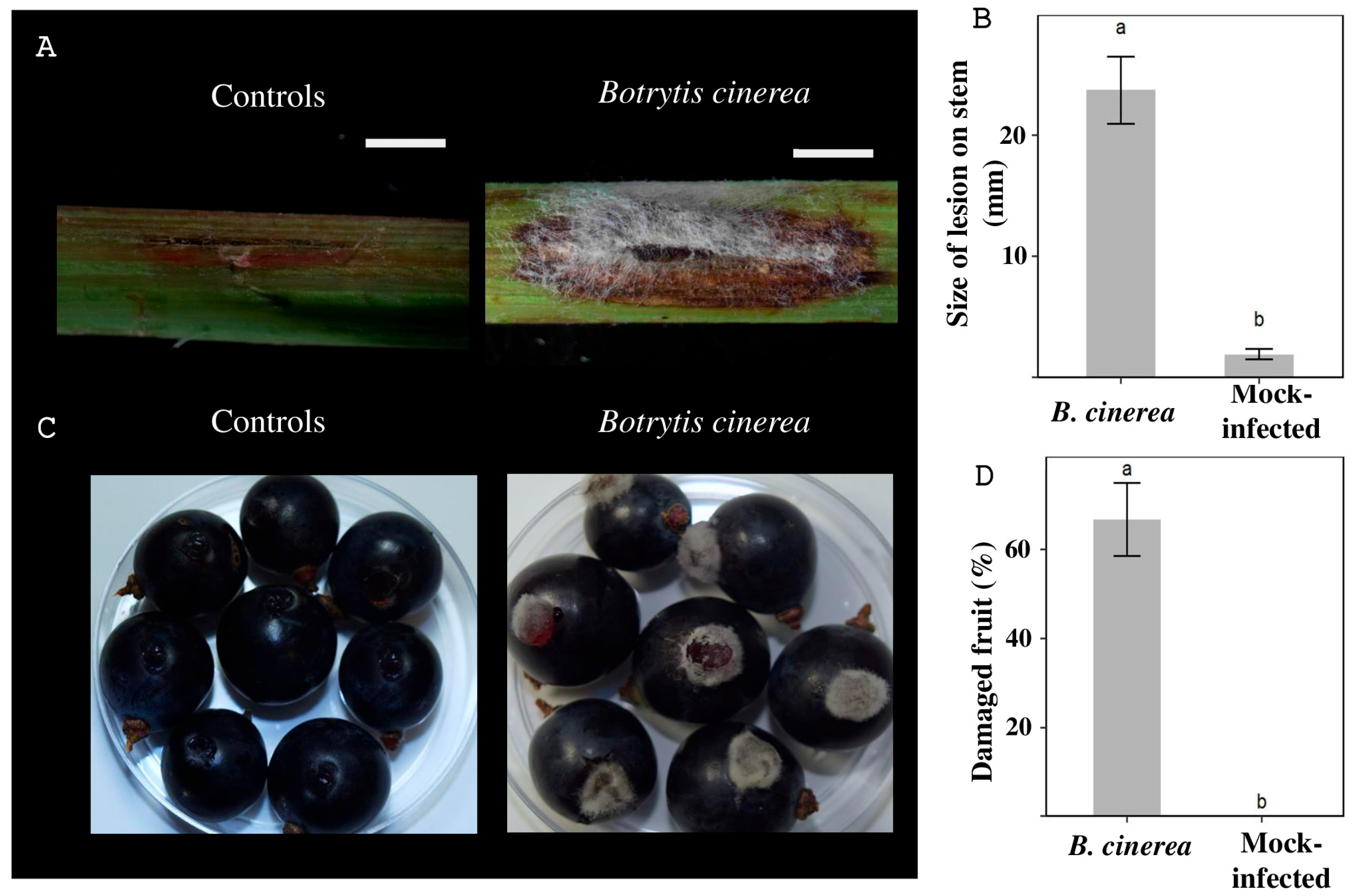 - Cheung, N.; Tian, L.; Liu, X.; Li, X. The Destructive Fungal Pathogen Botrytis cinerea—Insights from Genes Studied with Mutant Analysis. Pathogens 2020, 9, 923. [Google Scholar] [CrossRef]
