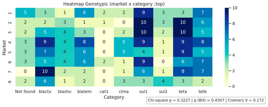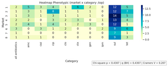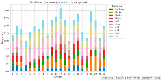 To investigate potential associations between phenotypic and genotypic resistance categories across markets and cheeses, chi-square tests of independence were performed on the main categories. Cramér’s V was computed to estimate effect sizes, and p-values were adjusted using the Benjamini–Hochberg procedure. The analyses indicated associations between market and resistance categories, as well as patterns of phenotypic and genotypic resistance distribution across cheeses. Statistical analyses were conducted in Python (version 3.11; Python Software Foundation, Wilmington, DE, USA).