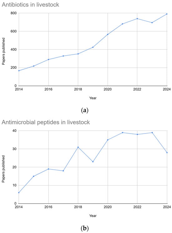 Graphs showing the number of publications over a ten-year period (2014–2024). Graph (a) depicts the number of papers published using the keywords “antibiotics in livestock”, whereas graph (b) depicts the number of papers published using the keywords “antimicrobial peptides in livestock”.