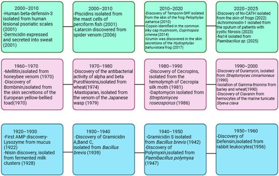 Timeline of key milestones in the discovery of AMPs (1922–2025). Figure made with Biorender (https://www.biorender.com/, accessed on 3 October 2025).