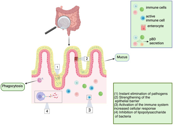 Multifunctional roles of pBD. Porcine β-defensins (pBDs) are secreted by a variety of specialized cells of the immune system. The roles of pBDs extend beyond direct antimicrobial activity against bacteria, viruses, and fungi; pBDs also possess the ability to neutralize lipopolysaccharides (LPS). These findings suggest that pBDs play a pivotal role in immunomodulating host cells, triggering immune activation and boosting cellular immune responses, thereby enhancing the ability of the host to combat target pathogens. Some of these mechanisms include enhanced phagocytosis, fine-tuned activation of the immune system, and the strengthening and maintenance of epithelial barrier integrity. Figure made with Biorender.