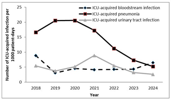 A patient was defined as having a HAI if pneumonia, bloodstream infection, UTI [], or HA-CDI [,] was acquired during ICU stay. All clinical specimens obtained from patients with HAIs were processed according to the routine diagnostic protocols of the Institute of Microbiology, MMA. Species-level identification was performed using matrix-assisted laser desorption/ionization time-of-flight mass spectrometry (MALDI-TOF; VITEK MS, bioMérieux, Marcy l’Etoile, France, Myla V4.9.2 VMS software V3.2 VMS ID Knowledge Base (IVD) V3.3). Since 2021, phenotypic detection of carbapenemase production has been performed using the NG-Test CARBA 5 immunochromatographic assay (NG Biotech, Guipry, France, V9.04.4). Antimicrobial susceptibility testing (AST) was carried out using the standard disk diffusion method in accordance with the European Committee on Antimicrobial Susceptibility Testing (EUCAST) guidelines. Minimum inhibitory concentrations (MICs) were determined using the Vitek2 Compact automated system (bioMérieux, Marcy l’Etoile, France). Colistin MIC determination was performed using the commercial broth microdilution method ComASP® Colistin 0.25–16 (Liofilchem, Roseto degli Abruzzi, Italy). Quality control procedures followed the respective manufacturers’ instructions. Susceptibility to selected AMR markers was interpreted according to bacterial species as follows: Staphylococcus aureus: oxacillin (OXA), glycopeptides (GLY); Enterococcus spp.: GLY; Enterobacterales (Escherichia coli, Klebsiella spp., Enterobacter spp., Proteus spp., Citrobacter spp., Serratia spp., Morganella spp., Providencia spp.): third-generation cephalosporins (C3G: cefotaxime [CTX], ceftriaxone [CRO], ceftazidime [CAZ]); carbapenems (CAR: imipenem [IPM], meropenem [MEM], ertapenem [ETP]); Pseudomonas aeruginosa: CAR (IPM, MEM); Acinetobacter spp.: CAR (IPM, MEM).