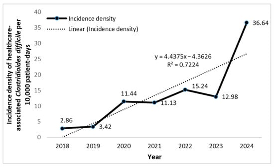 The ID of HA-CDI was lowest in 2018 (2.86 per 10,000 patient-days) and highest in 2024 (36.6 per 10,000 patient-days). A clear upward trend in HA-CDI ID was observed over time, with an average increase of 4.44 units per year. The model explained 72.24% of the variation (R2 = 0.72), indicating a strong time-related correlation.
