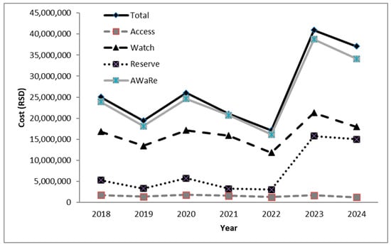 Assessment of the economic burden on the ICU due to the use of antibiotics (according to WHO Access Watch Reserve Classification). RSD—Serbian dinars; AWaRe—Access Watch Reserve.