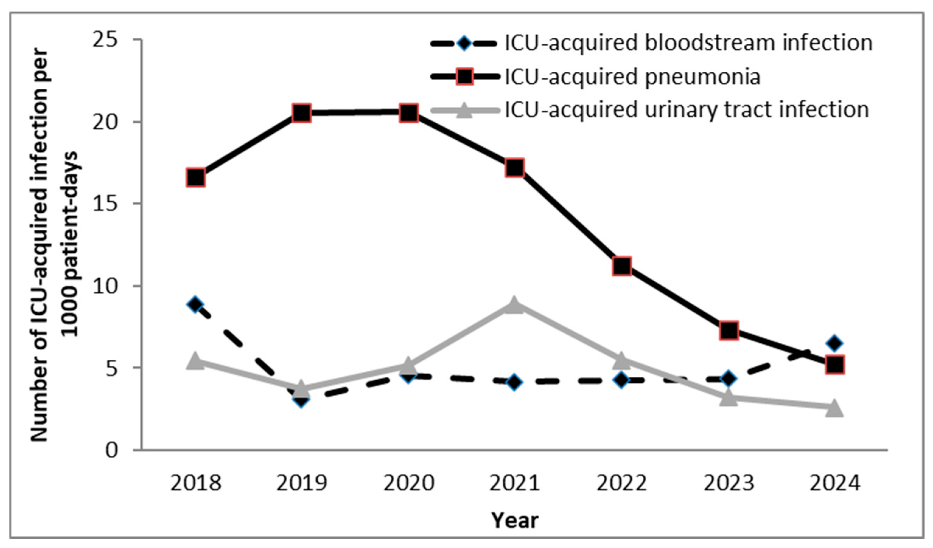 | Pneumonia/VAP | 14.1/20.0 per 1000 patient-/ventilator-days | 6.8 per 1000 patient-days | 11.96 per 1000 ventilator-days |