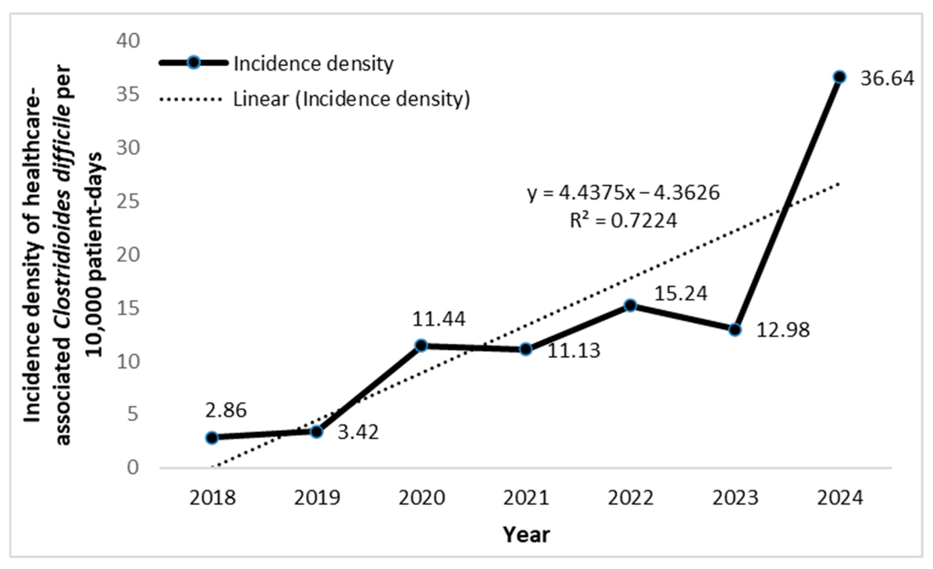 - UK Government. Increase in Clostridioides Difficile Infections: Technical Report. Available online: https://www.gov.uk/government/publications/increase-in-clostridioides-difficile-infections-technical-report/increase-in-clostridioides-difficile-infections-cdi-current-epidemiology-data-and-investigations-technical-report (accessed on 19 September 2025).