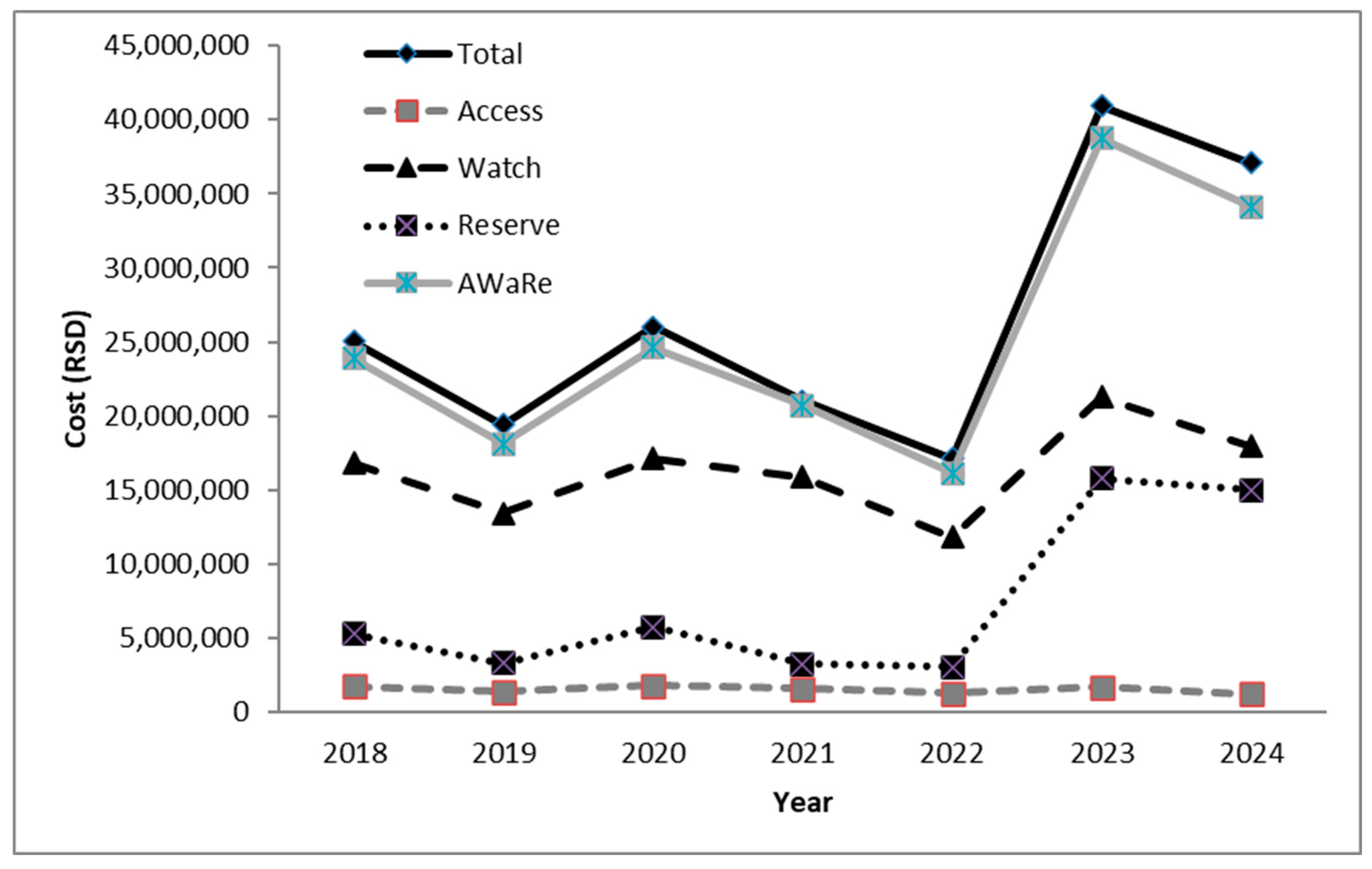 - Medić, D.; Božić Cvijan, B.; Bajčetić, M. Impact of antibiotic consumption on antimicrobial resistance to invasive hospital pathogens. Antibiotics 2023, 12, 259. [Google Scholar] [CrossRef]